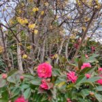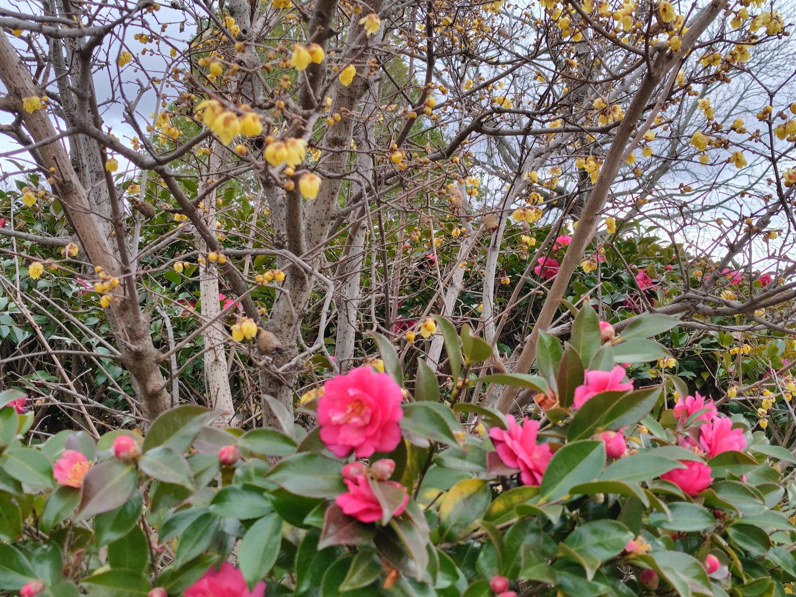 蝋梅の足元にはサザンカが ! 綺麗だね 蝋梅のアマイ香りも満喫